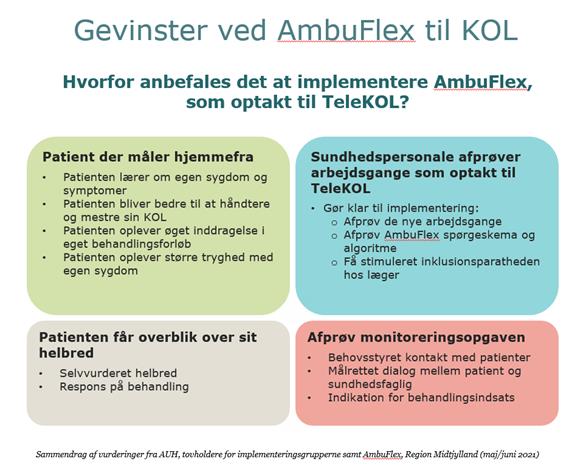 AmbuFlex er en PRO-løsning i stordrift i Midtjylland, der er i daglig drift på mere end 30 sygdomsområder og brugt af over 60.000 patienter. AmbuFlex til KOL er siden 2014 anvendt på Regionshospitalet Silkeborg og fra 2017 også implementeret på Lungemedicinsk Afdeling, Aarhus Universitetshospital, her i et tæt samarbejde med Aarhus Kommune.
