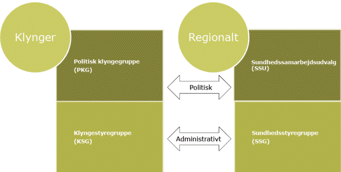 Formålet med sundhedsklynger er at styrke sammenhæng, nærhed og lighed. I vores nuværende organisering er der jf. kommissorierne nedenstående opgavefordeling mellem klynger og Sundhedsstyregruppe/Sundhedskoordinationsudvalg. Det understøtter en opgavefordeling, hvor klyngerne skaber nyudvikling og sikrer implementering af fælles aftaler, samt et niveau for regionsdækkende samarbejdsaftaler, der bidrager til at sikre geografisk lighed og at skabe ensartede og sammenhængende forløb for de patienter, som bevæger sig på tværs af klynger.